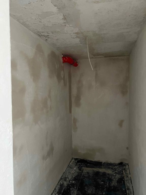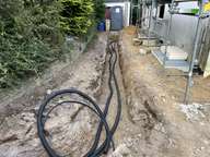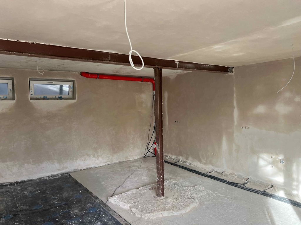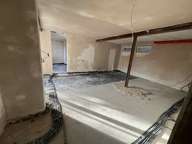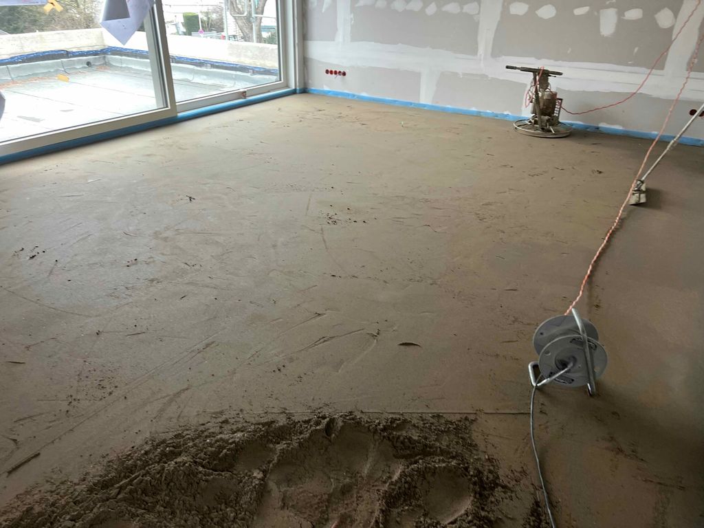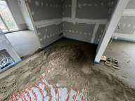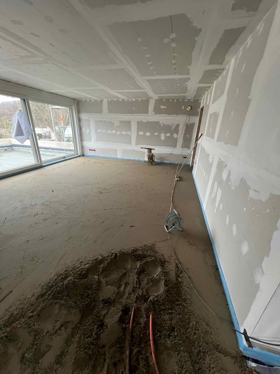 Nachdem alle Vorarbeiten und der Einbau der Fußbodenheizung abgeschlossen sind, kommt nun der Estrich.